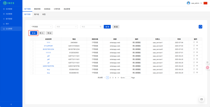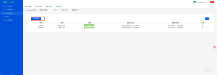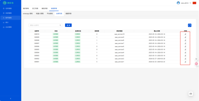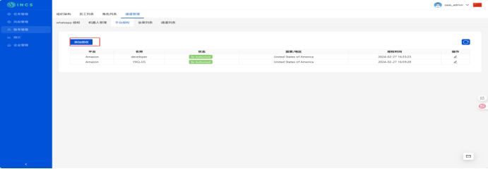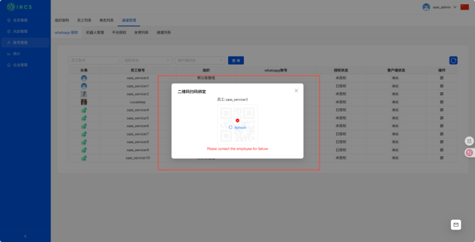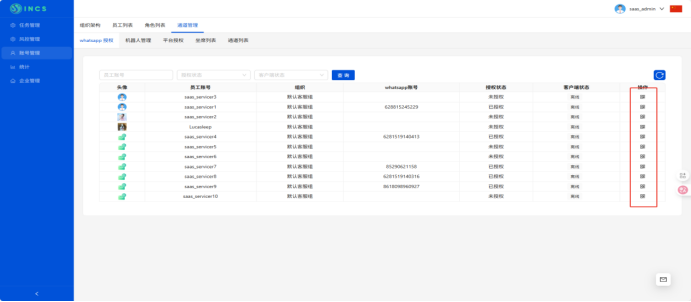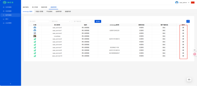 管理员可以在“账号管理-通道管理-whatsapp授权”页面对客服人员的whatsapp个号集中绑定授权