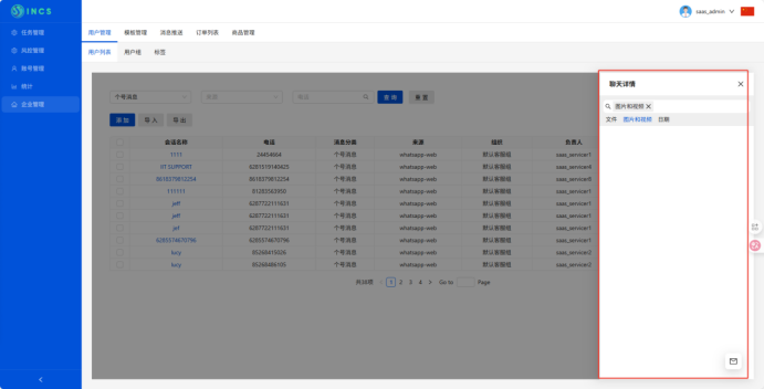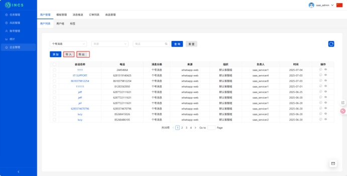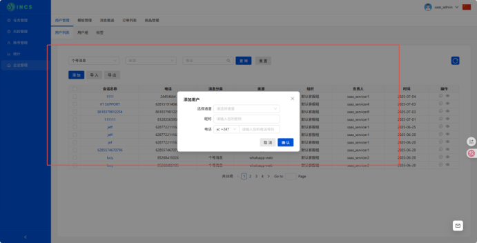 管理后台: 面向管理员及客服主管,提供全面的团队管理、实时监控、任务分配及营销信息群发能力,赋能管理者进行高效的日常运营监督与资源调度。