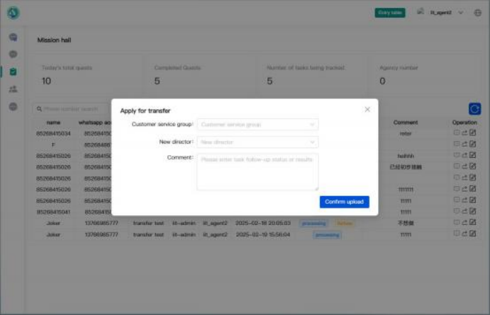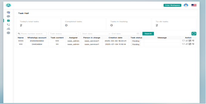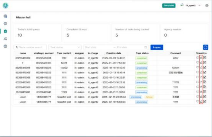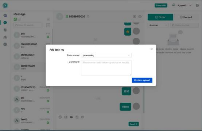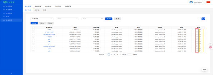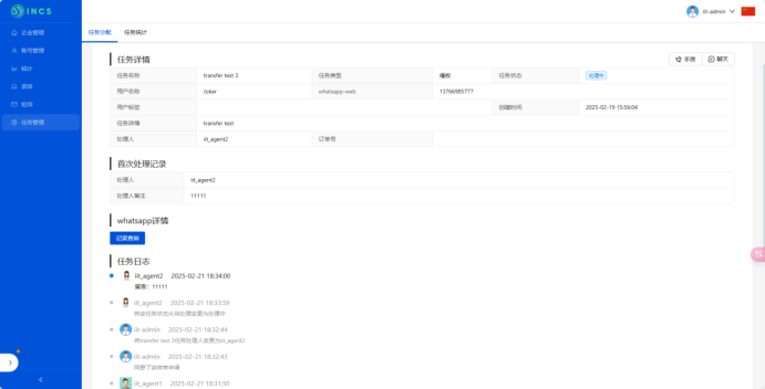 客服点击操作的第一个图标就可以跳转到该用户的 whtasapp 的个号聊天框,进行任务工单的处理,工作处理完成过后可以对当前的工单任务进行变更,变更完成会记录在后台的工单任务记录当中。