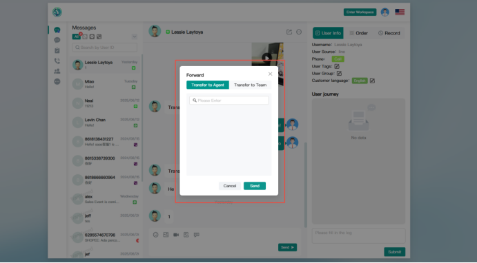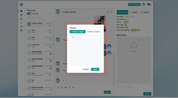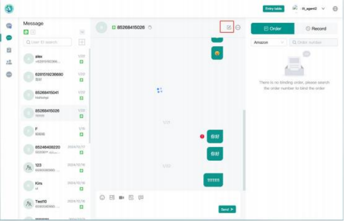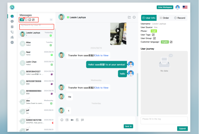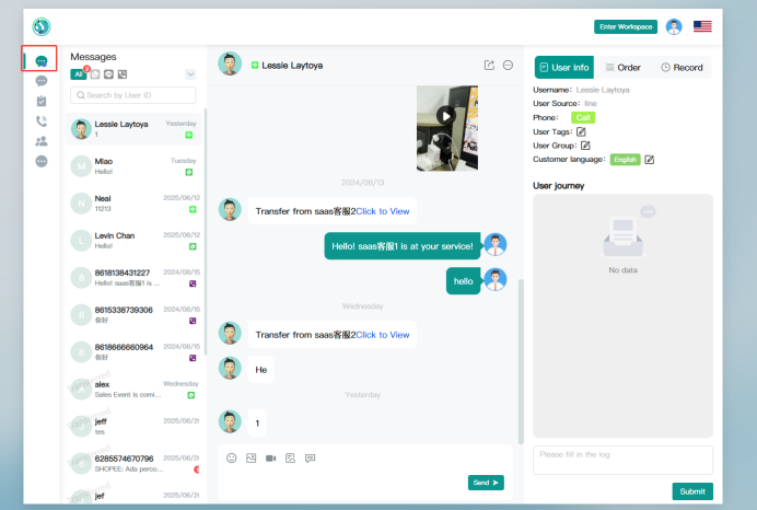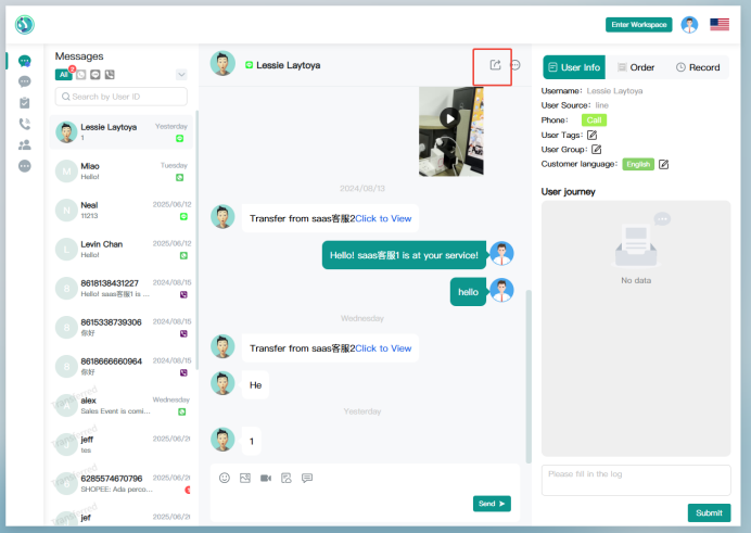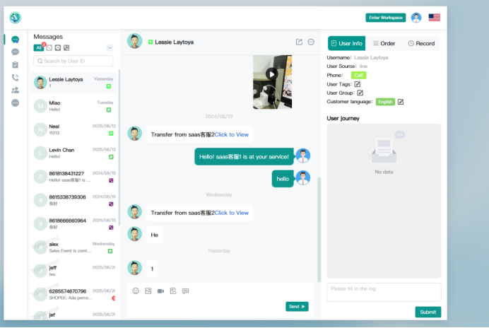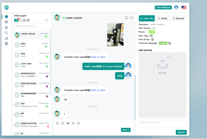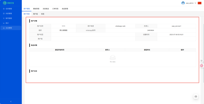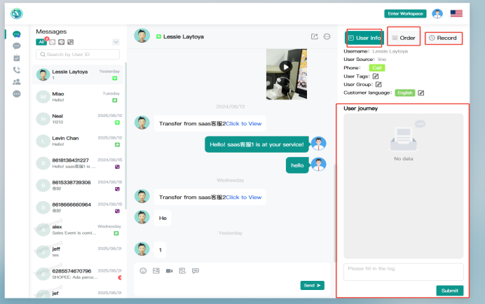 聊天的右边侧边栏可以查看与该用户聊天的用户详情,聊天记录,还可以查找改用户的订单与用户进行绑定,并且在用户信息下面可以根据当前聊天的情况添加用户日志,方便后续的聊天任务。