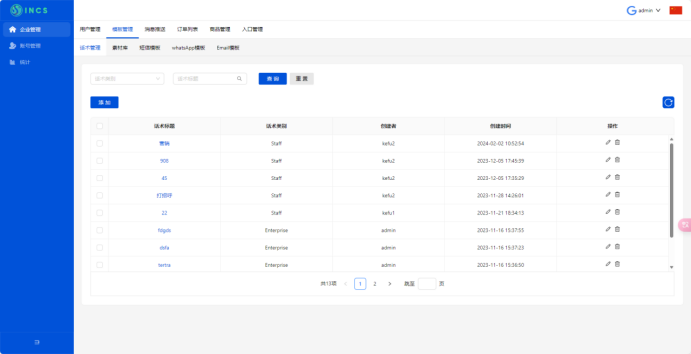功能设置:话术管理、素材库、whatsapp模板、E-mail模板、