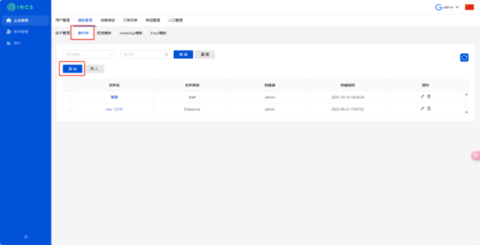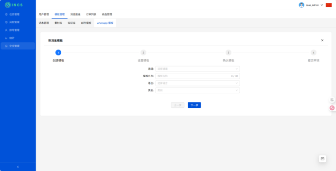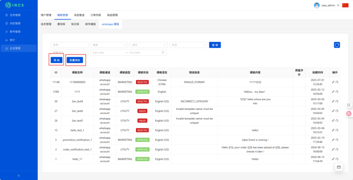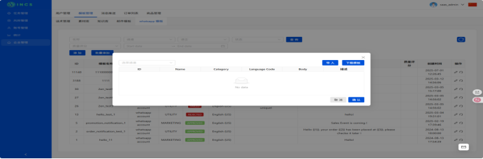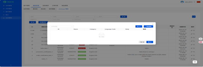 管理员可以在“企业管理-模板管理-whatsapp模板”里面添加whatsapp模板,添加成功过后用作whatsapp模板发送时使用 (注意:whatsapp官方账号主动跟用户发消息的第一条消息只能发送模板消息,发送的模板消息在这里申请)
