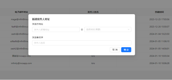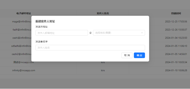 管理员与客服可以创建收件人地址,适用于E-mail消息推送使用,新建发件人地址需要有已验证的域名(验证域名的操作请联系我们的客服人员协助完整),添加完成过后就可以在群发消息推送时使用这个发件人地址。