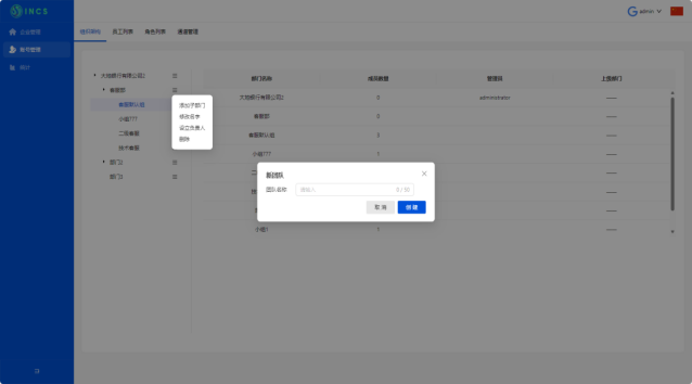 管理员可以在“账号管理-组织架构”针对组织架构进行设置,添加子部门,设立负责人。