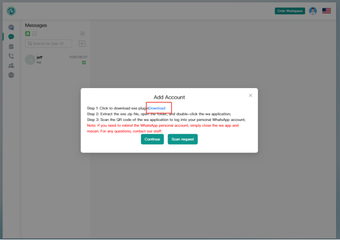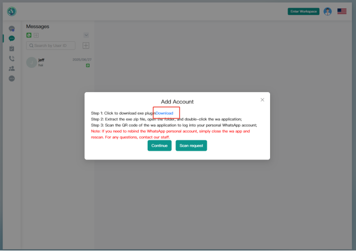 个人号的页面布局和官号功能布局基本一致,但是个号消息必须绑定个号whatsapp 才能 使用和接收消息,接下来教程如何绑定个人 whatsapp 账号。