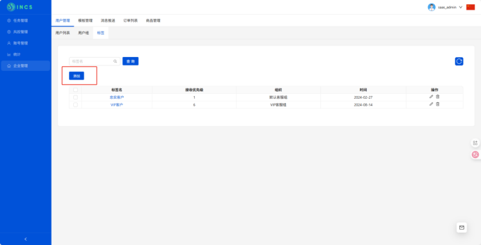 管理员可以在“企业管理-用户管理-用户组”,“企业管理-用户管理-标签”添加用户标签,添加用户组
