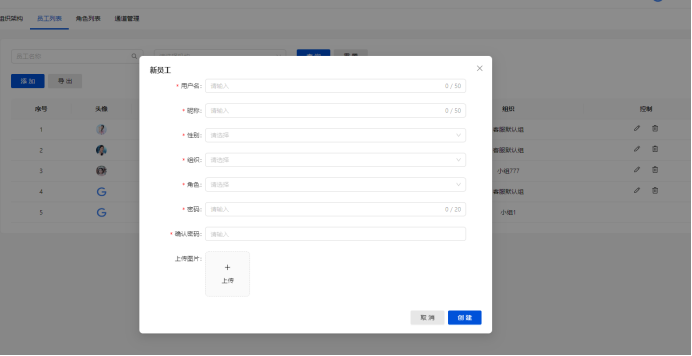 账号管理:组织架构、员工列表、角色列表、通道管理