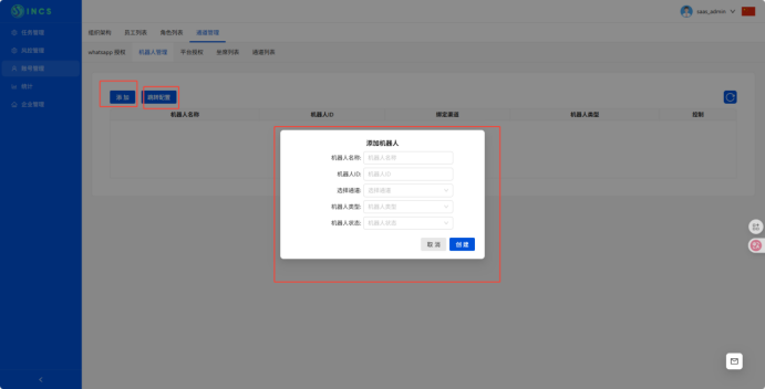 操作:点击添加按钮添加机器人,点击跳转配置,跳转到对应的机器人管理页面操作。
