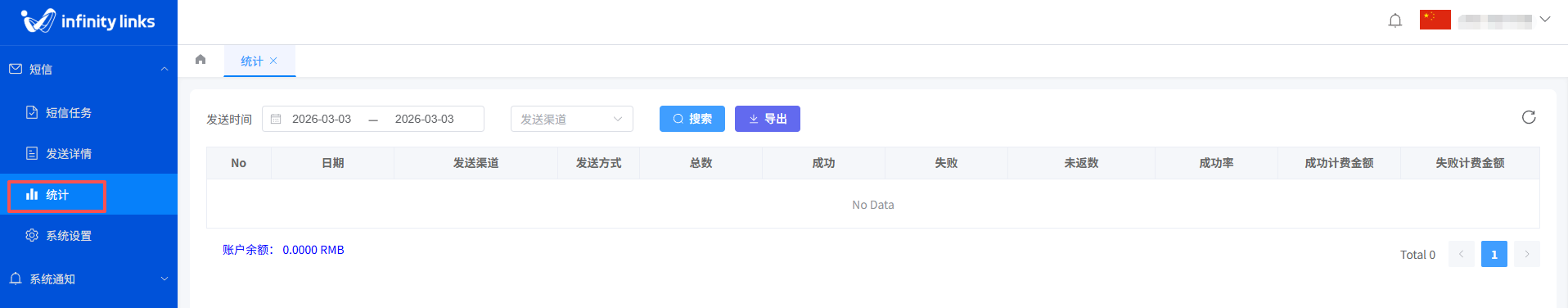 登录短信业务平台,在左侧导航栏选择 短信 > 统计,进入数据统计界面。