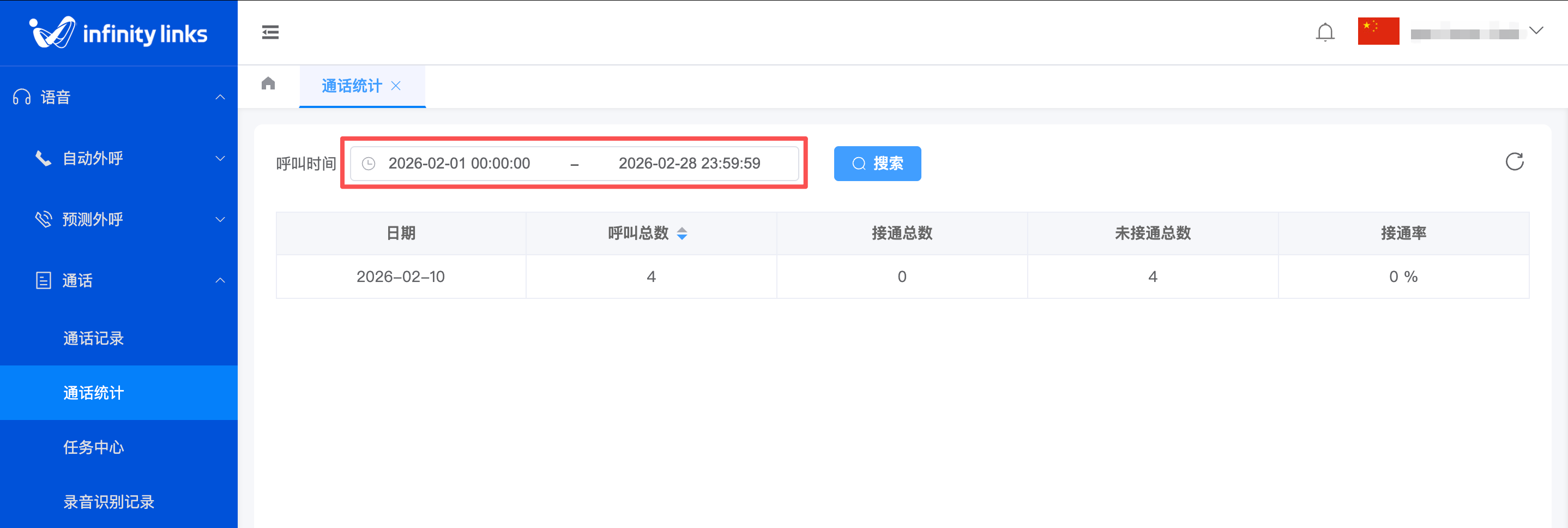- 未接通总数: 当日未能成功建立通话的数量 包含忙线、无应答、用户挂断、系统故障等所有非接通状态的记录。 (呼叫总数 = 接通总数 + 未接通总数)