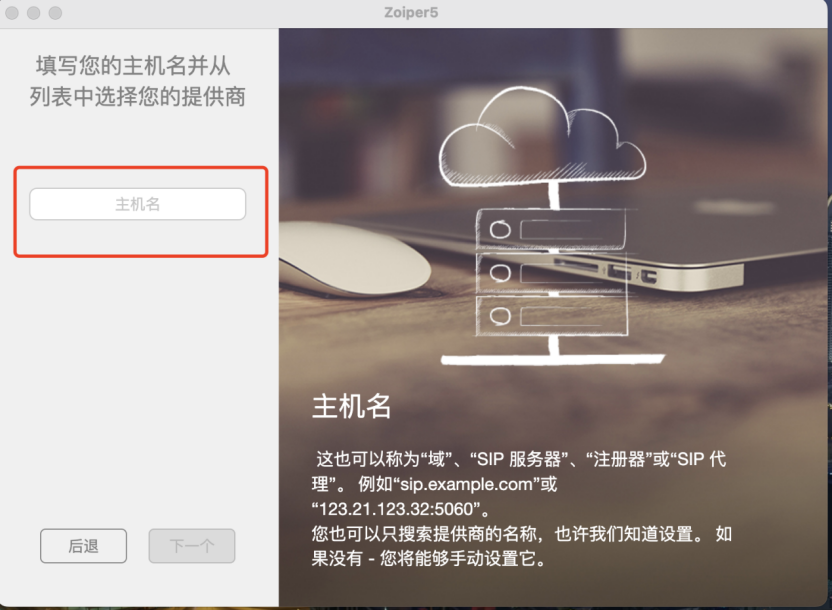 主机名输入我们提供的sip注册地址,选择对应国家的域名 如印尼填写:indo.infin8link.com:7060。 填写完点击下一个