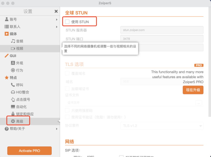 注意:一般情况系统会默认√,如有√,使用全球stun改为不使用