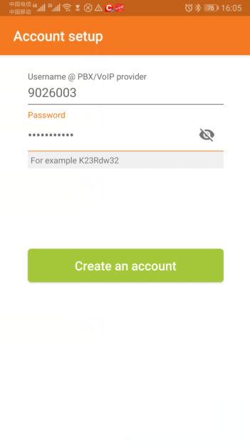 输入分机号和密码,然后点击“创建账户”(参见下图):