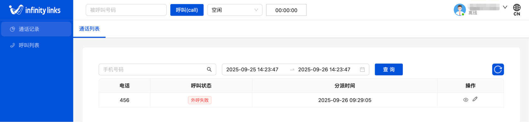 在通话列表页面顶部操作栏的右侧区域,可查看当前分机的登录状态(如:空闲、忙碌、离线等)。
