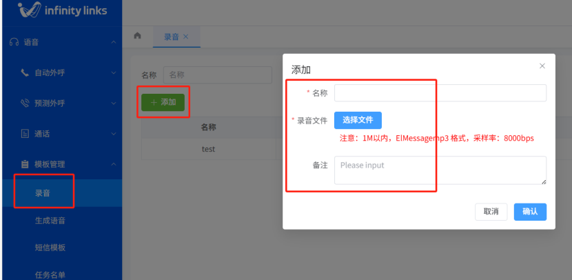 上传完成后,点击 「确认」,录音即存入模板库,可在创建外呼任务时调用。