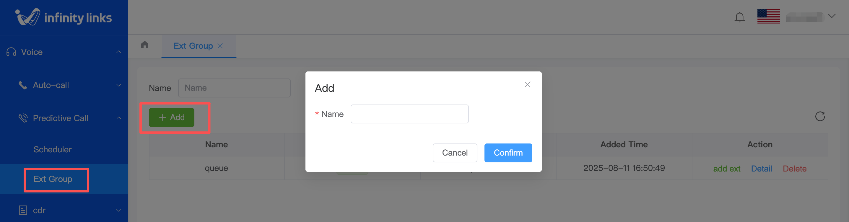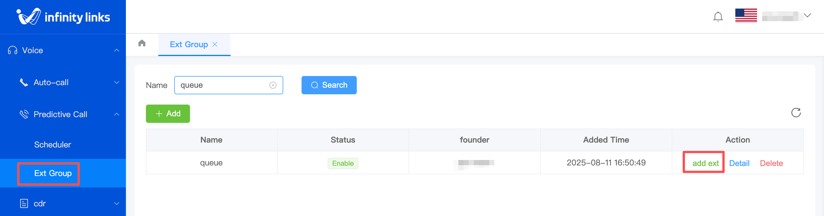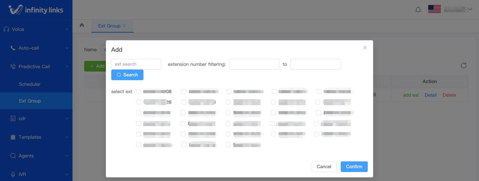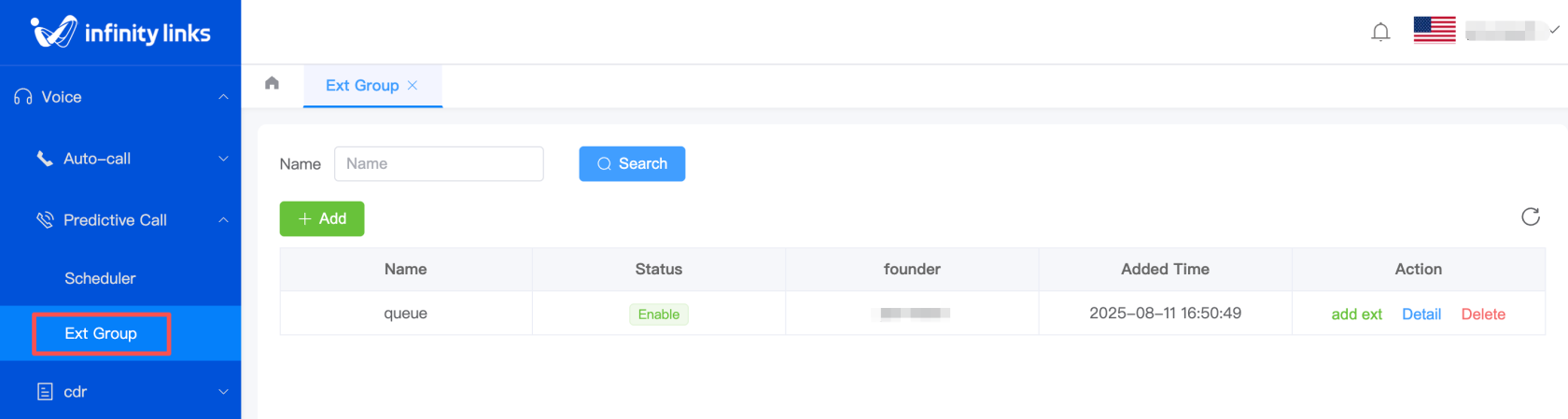 3.After the agent group is created, click "Add Extension" in the "Actions" column on the Agent Groups list page to add extensions to this group.