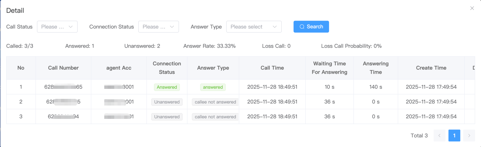 - Called: Number of calls already made / Total number of phone numbers